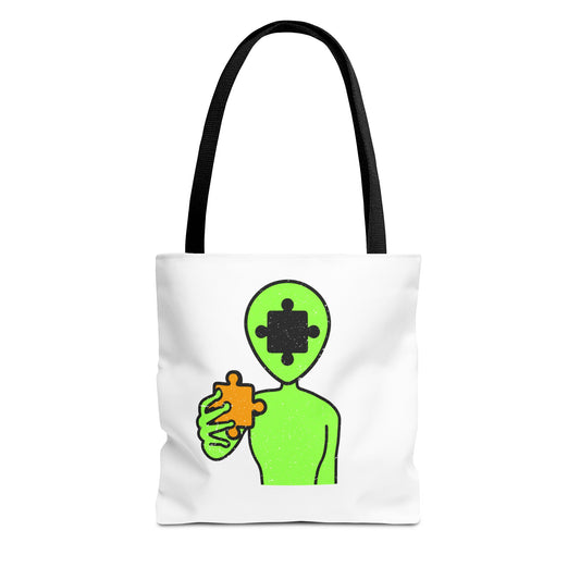 Distressed Tote Bag – Alien Puzzle Piece & Cow Abduction Design with ‘Fly’ Theme
