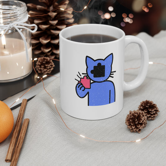 Cat Inspecting Puzzle Piece Mug – White Ceramic Coffee Cup with Clean Design for Curious Minds