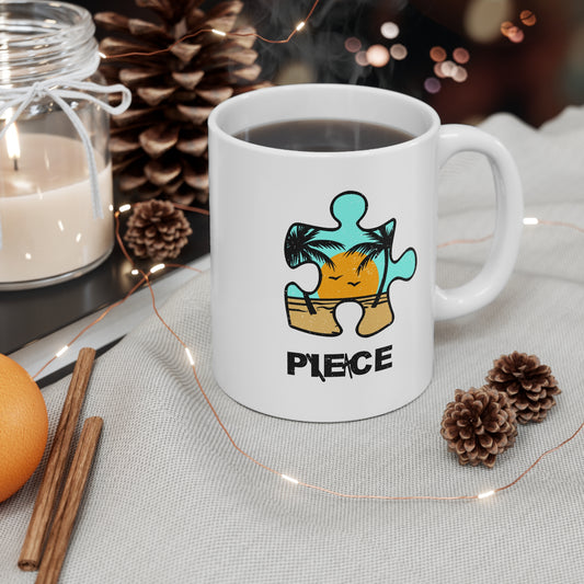 Distressed Peace Puzzle Piece Mug – Sunny Beach Graphic – White Ceramic Coffee Cup for Vintage Vibes