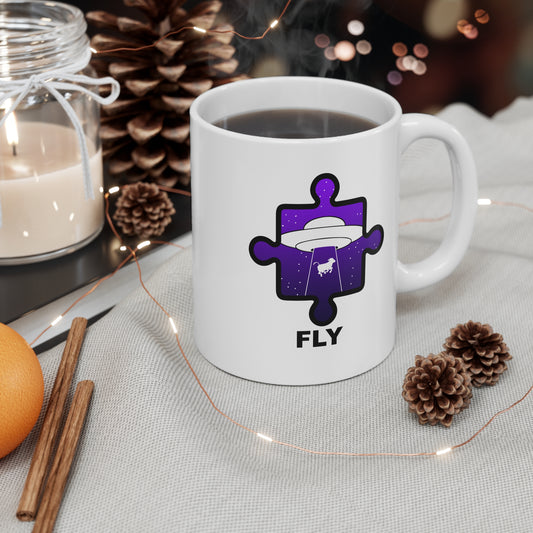 UFO Cow Abduction Mug – ‘Fly’ Puzzle Piece Graphic – 11oz Ceramic Cup